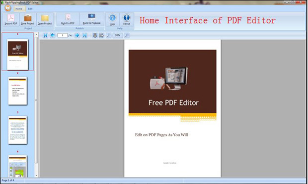 The layout of f FlashFlippingBook PDF Editor is very neat and clear for you to control edit of PDF. Two interfaces of FlashFlippingBook PDF Editor: Home and Edit. As you can see that in home interface of FlashFlippingBook PDF Editor, you can easily import and publish PDF, save and open project, and even view PDF as paeg flipping book with clicking “Build to Flipbook”. And in the edit interface, you can edit PDF easily with insert shape, font, shape style, color and line style, align shape, clipboard, edit columns.